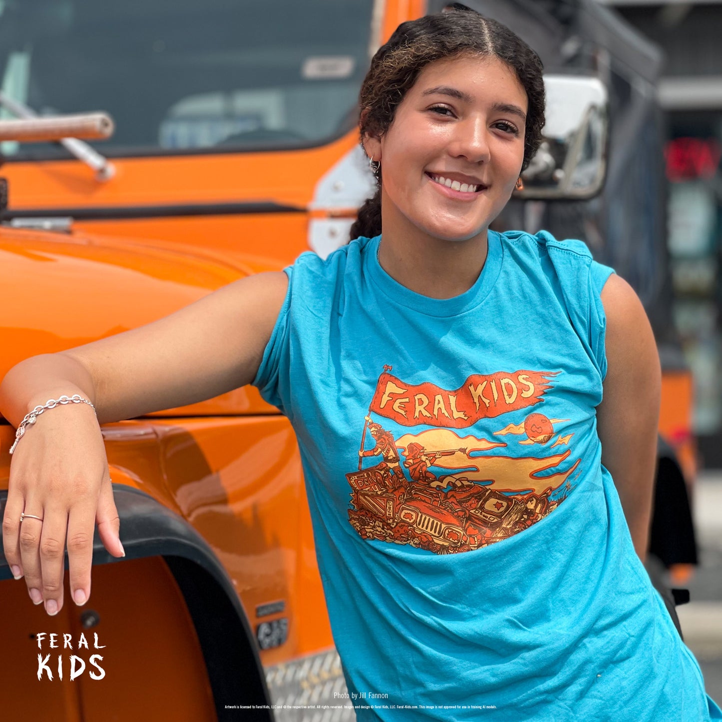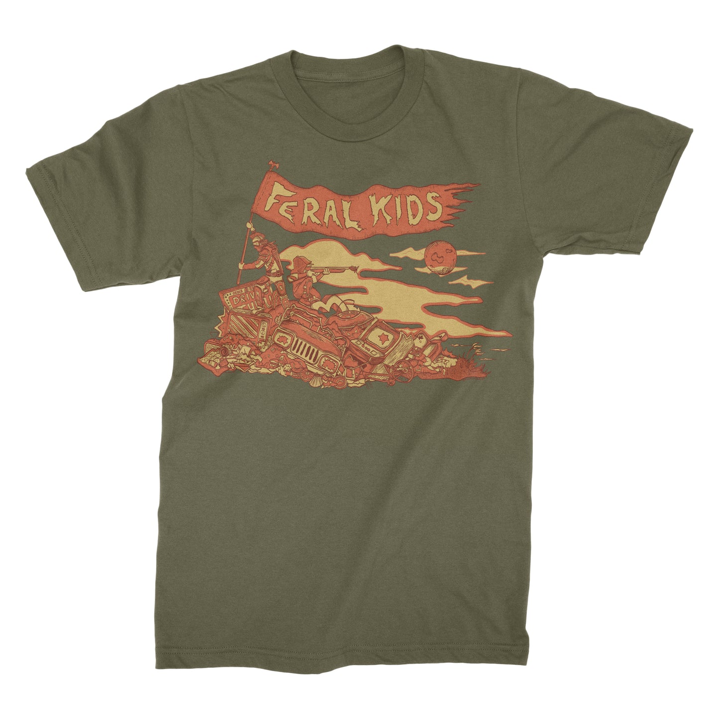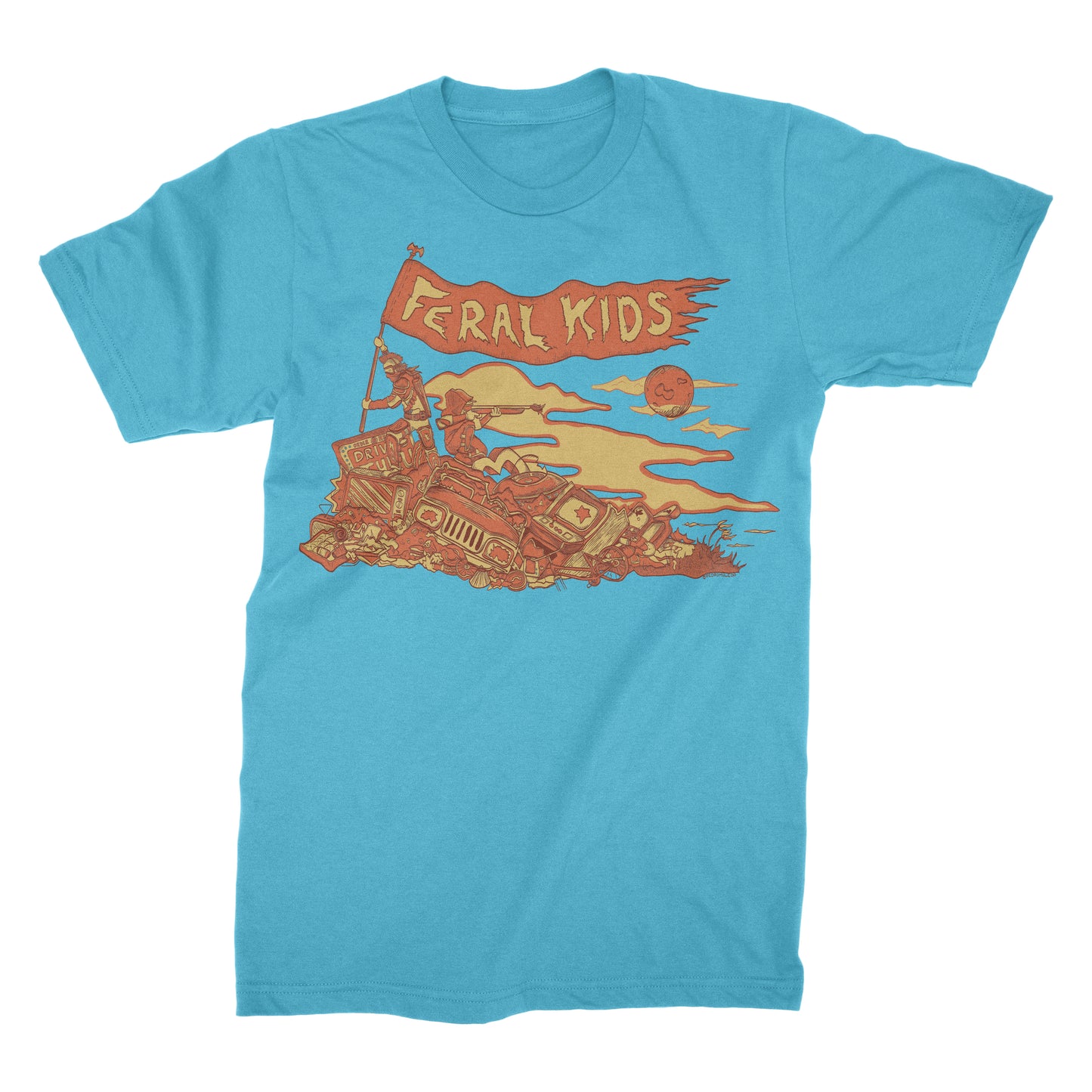Feral Hill Adult Softstyle T-Shirt: 3 color silkscreen print on green or blue tee, featuring original art by Pedro Mule @pedromule.