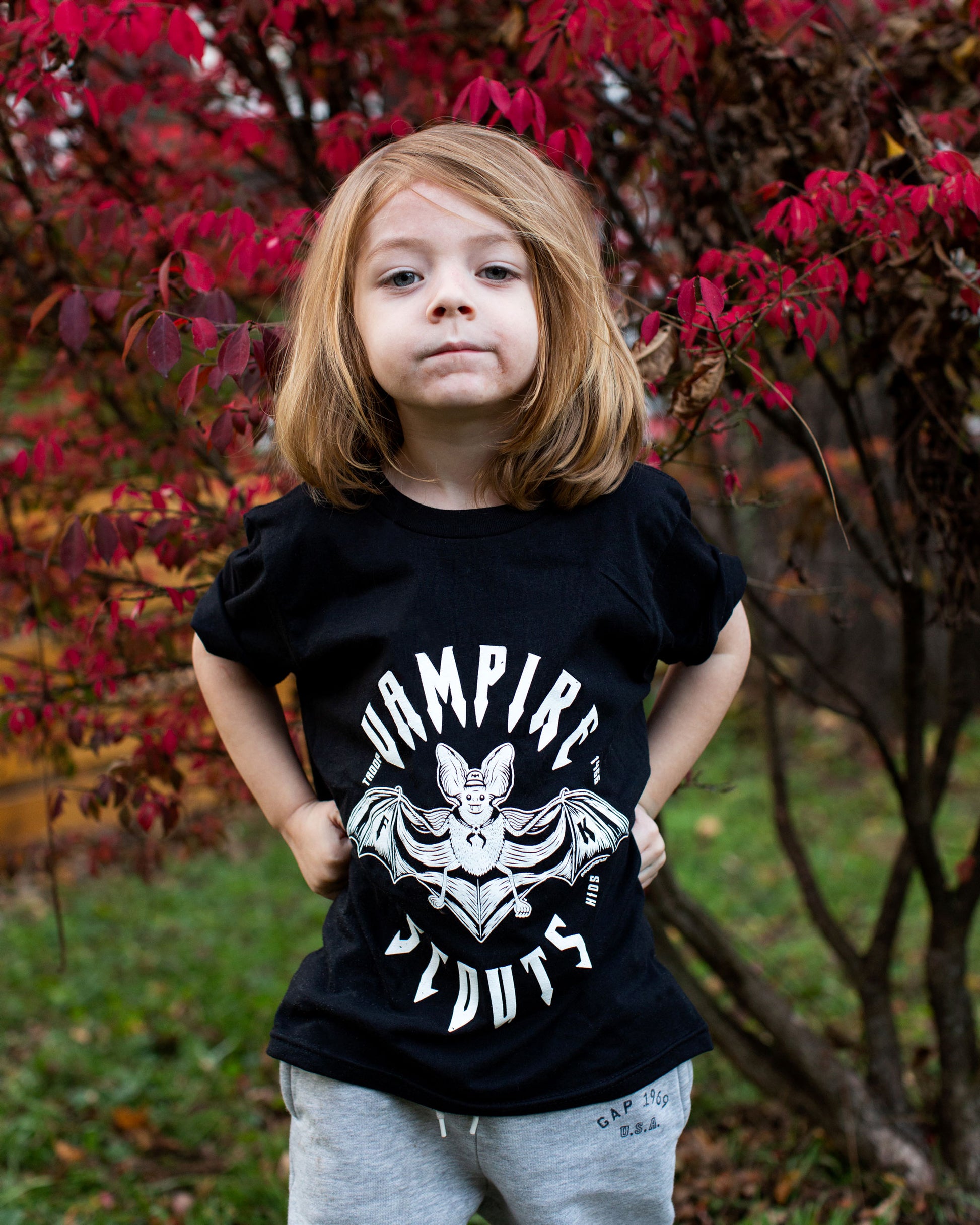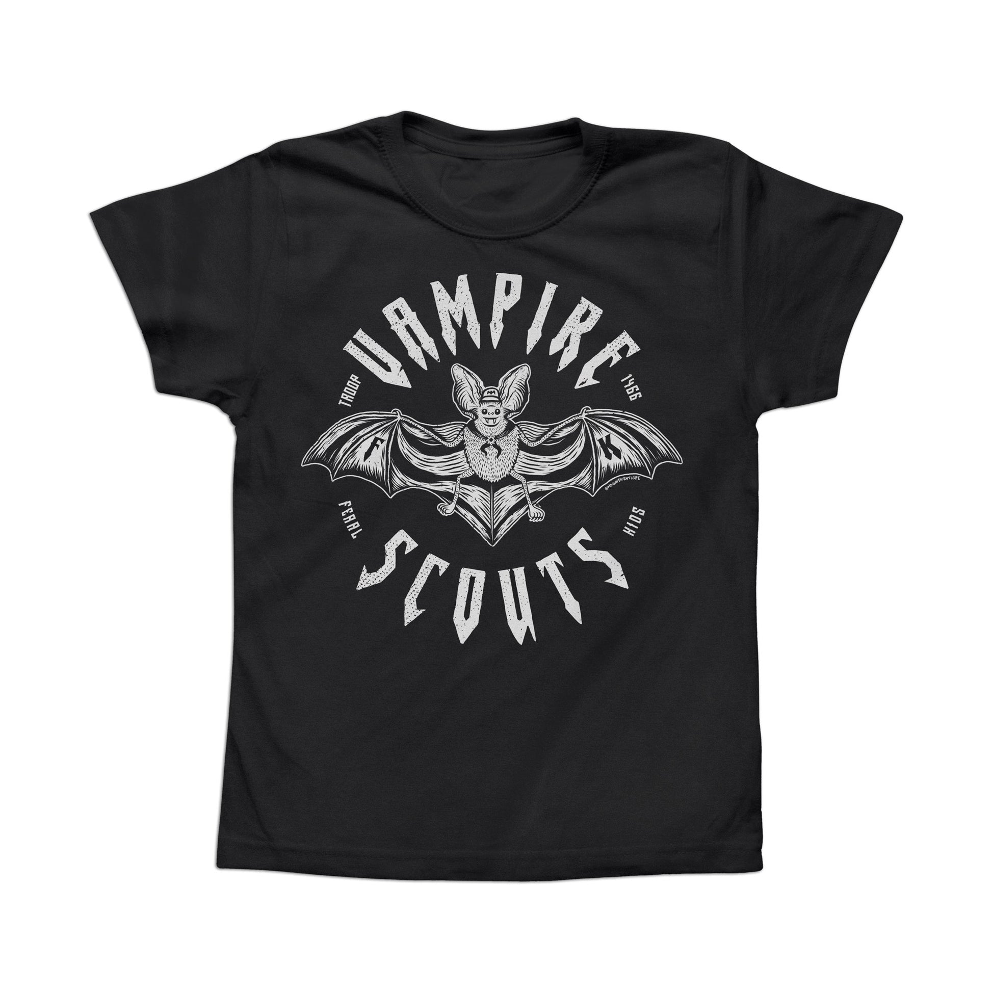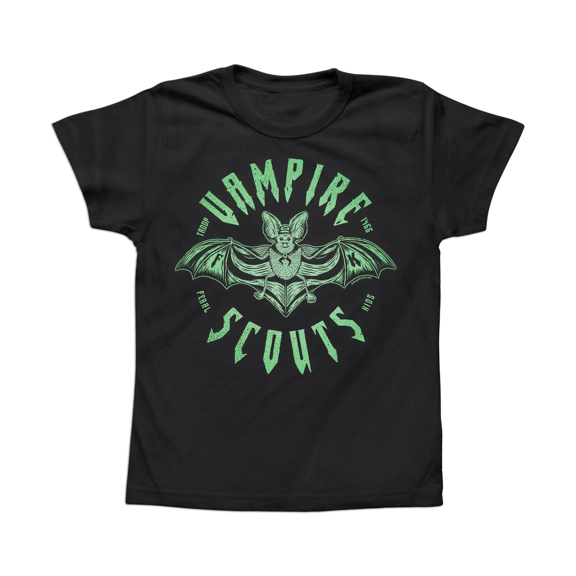 Vampire Scouts Youth Softstyle T-Shirt printed with GLOW IN THE DARK INK, featuring original art by Nick Prevas @magnificentlore.